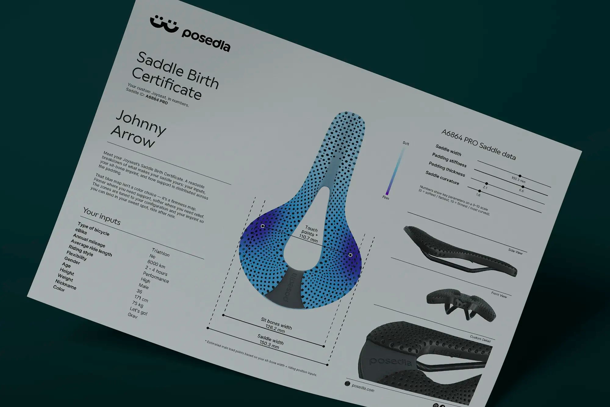 A one-page summary of your saddle: your key inputs, measured sit-bone width, and your firmness map.